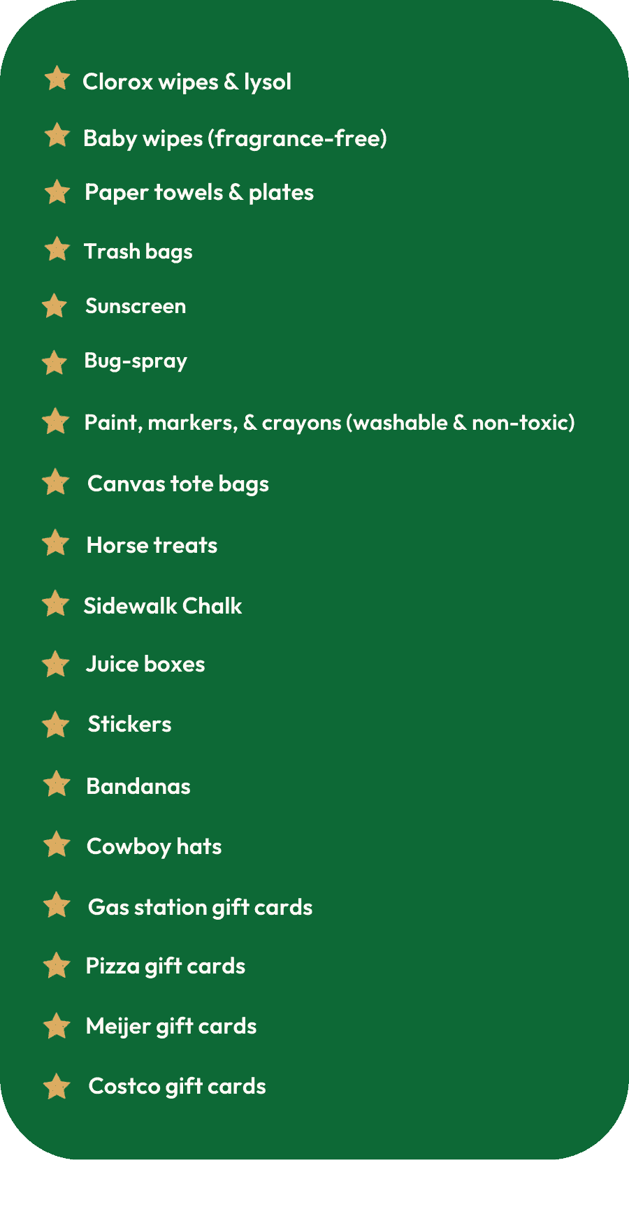 With your donation of supplies, we can continue to provide cost-free horseback riding programs to children and families in our community.